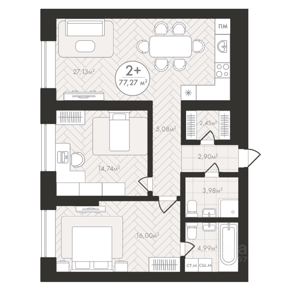 Продаётся 2-комнатная квартира в строящемся доме (Корпус 1), срок сдачи: III-кв. 2028, общей площадью 77.27 кв.м., на 24 этаже. Новый жилой комплекс "Пьермонт" от застройщика "СЗ АРТ-СИТИ" расположен по адресу Республика Башкортостан, Уфа, микрорайон Южный-2.