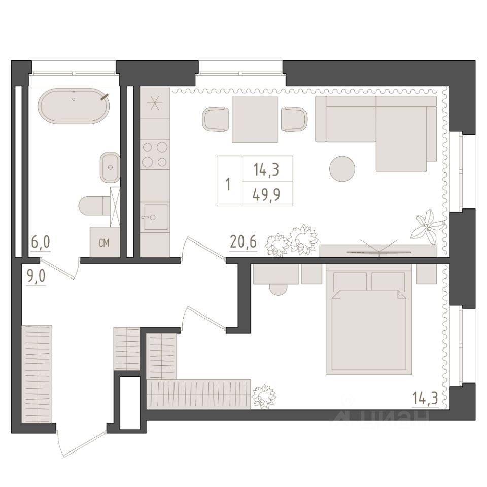 5-й этаж 23 - этажного жилого дома, общая площадь 49.9 кв. м., жилая площадь 14.3 кв. м. Срок окончания строительства: 1 квартал 2029 года