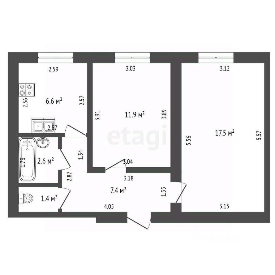 Общая площадь — 47,4 м², комнаты изолированные, санузел — раздельный.