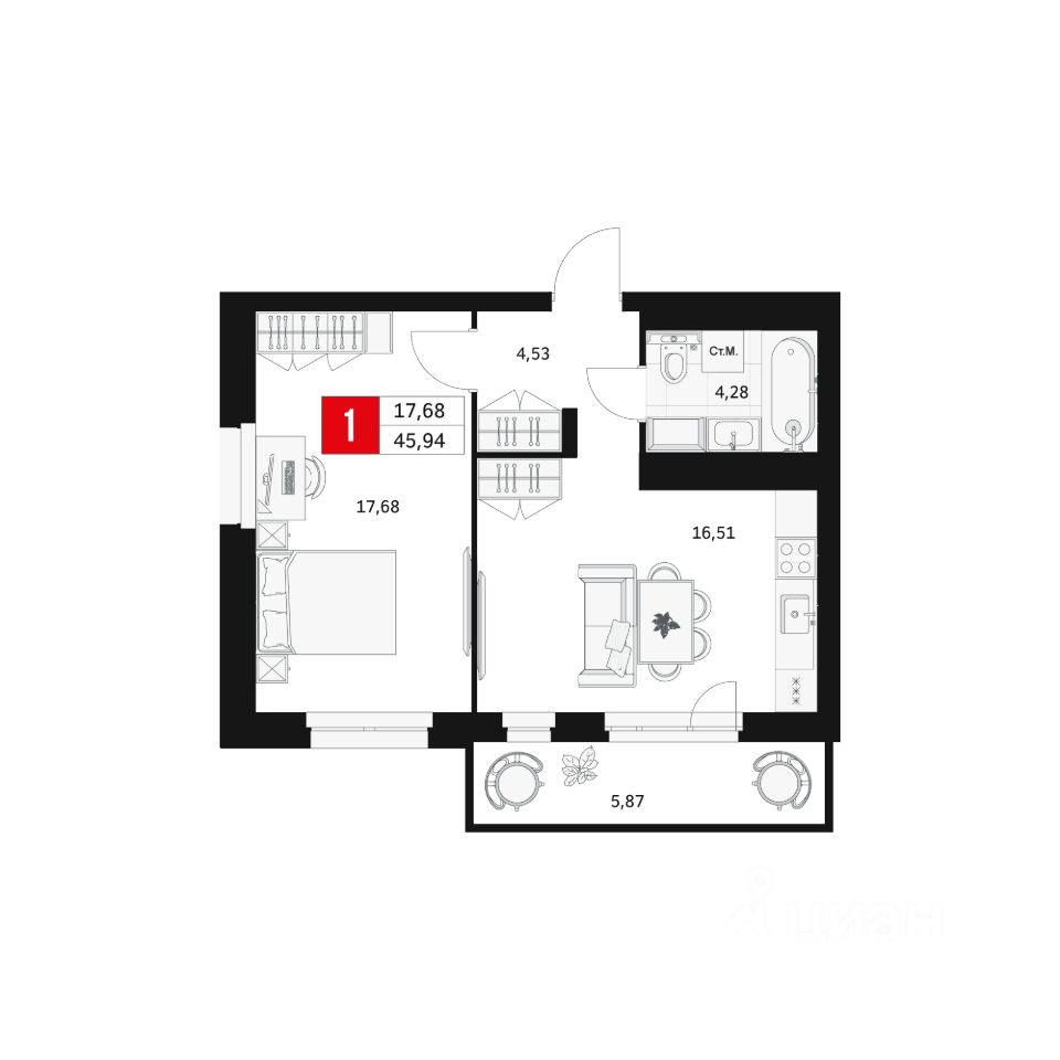 Общая площадь45,94 м²