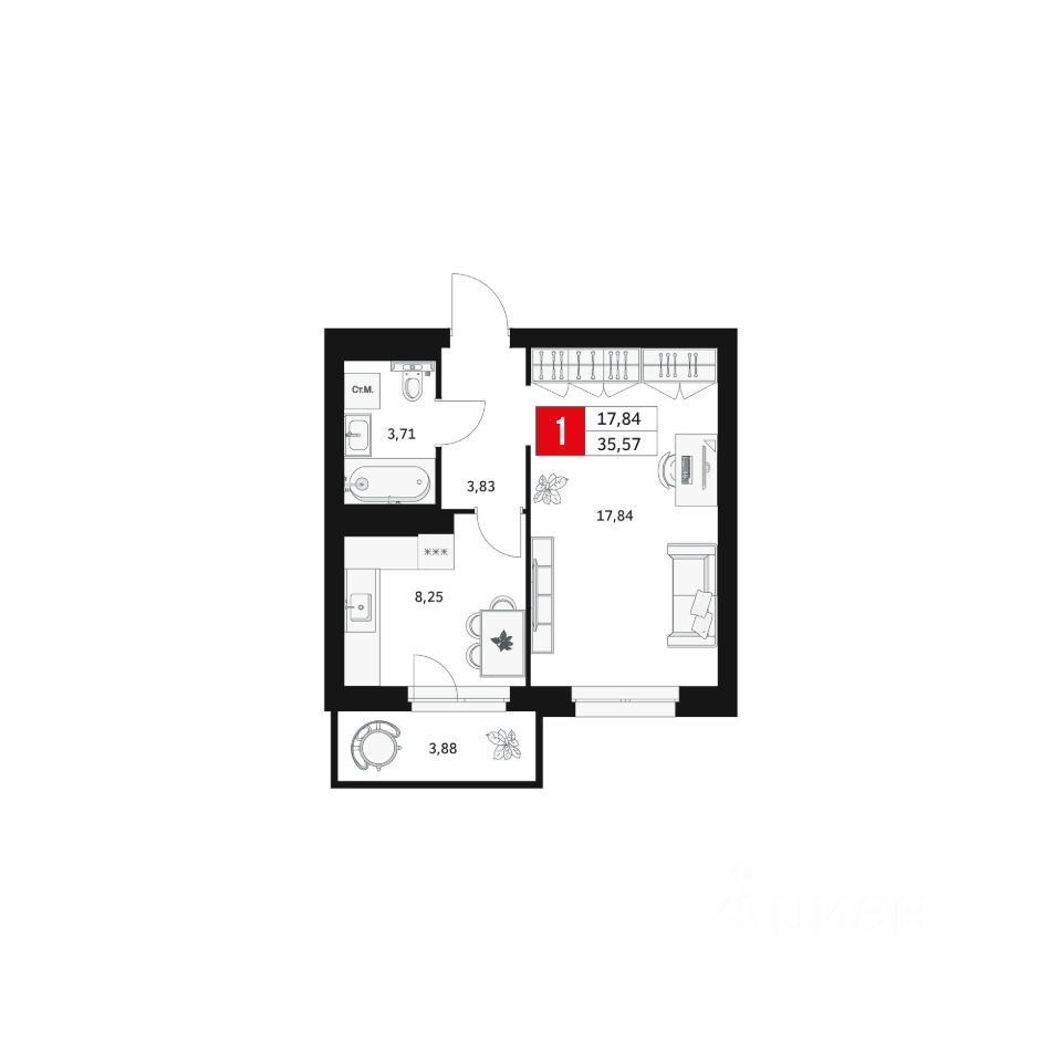 Общая площадь35,57 м²