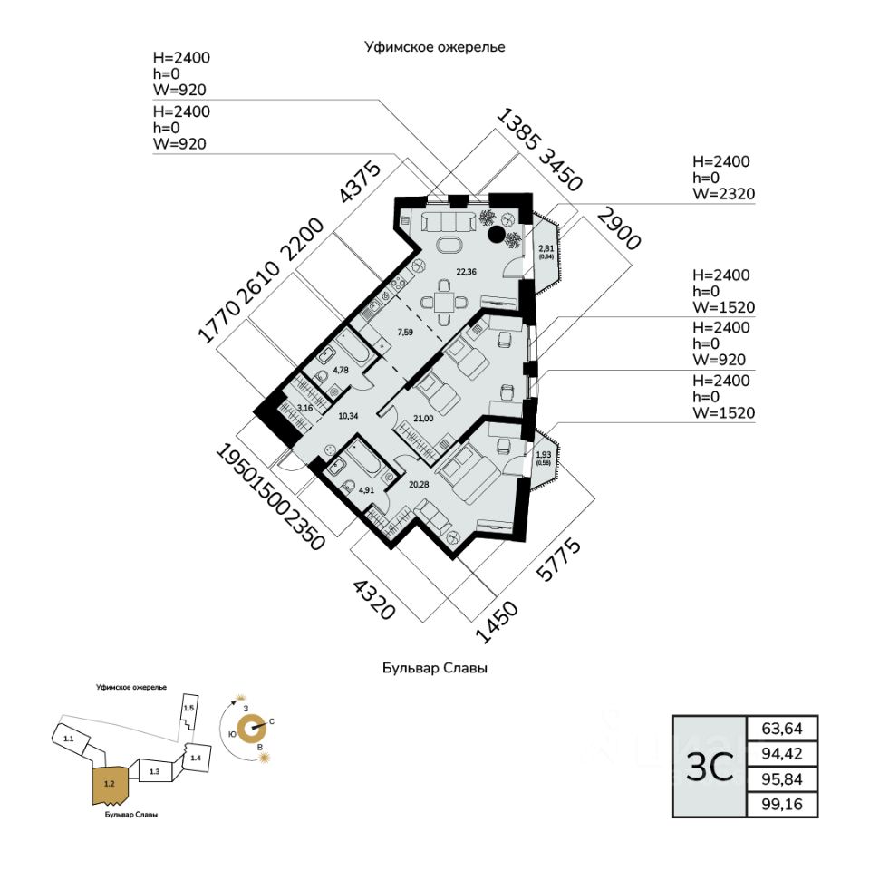 Общая площадь 95.84кв.м.;