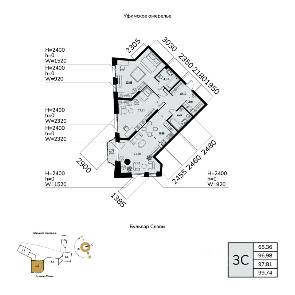 Общая площадь 97.81кв.м.;