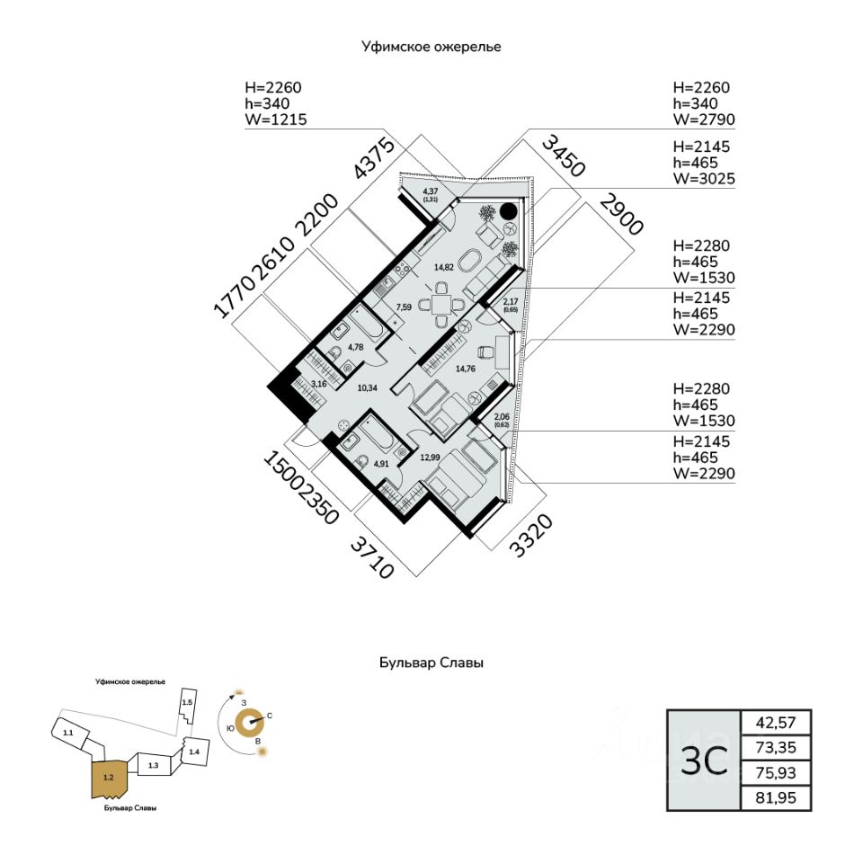 Общая площадь 75.93кв.м.;