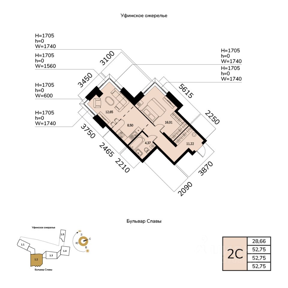 Общая площадь 52.75кв.м.;