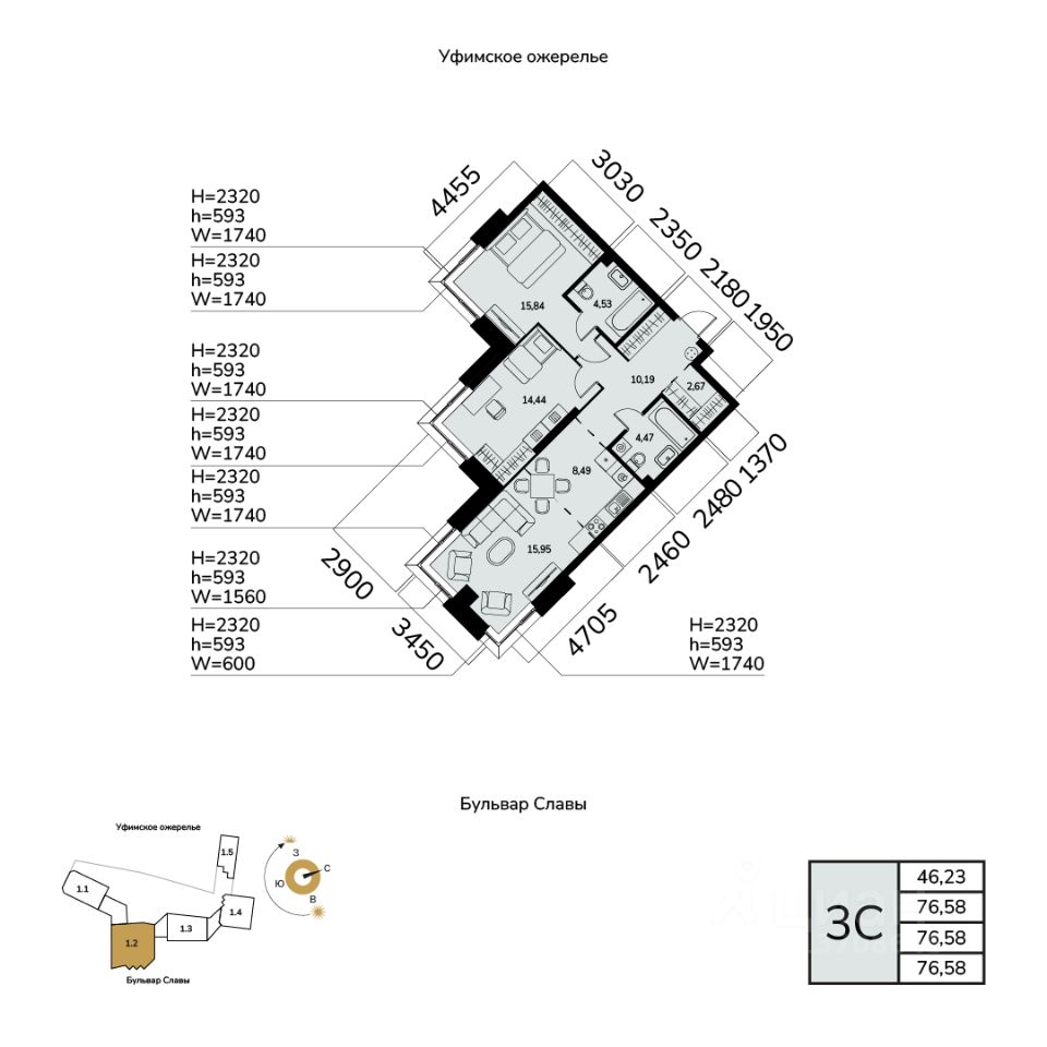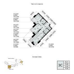 Общая площадь 76.58кв.м.;