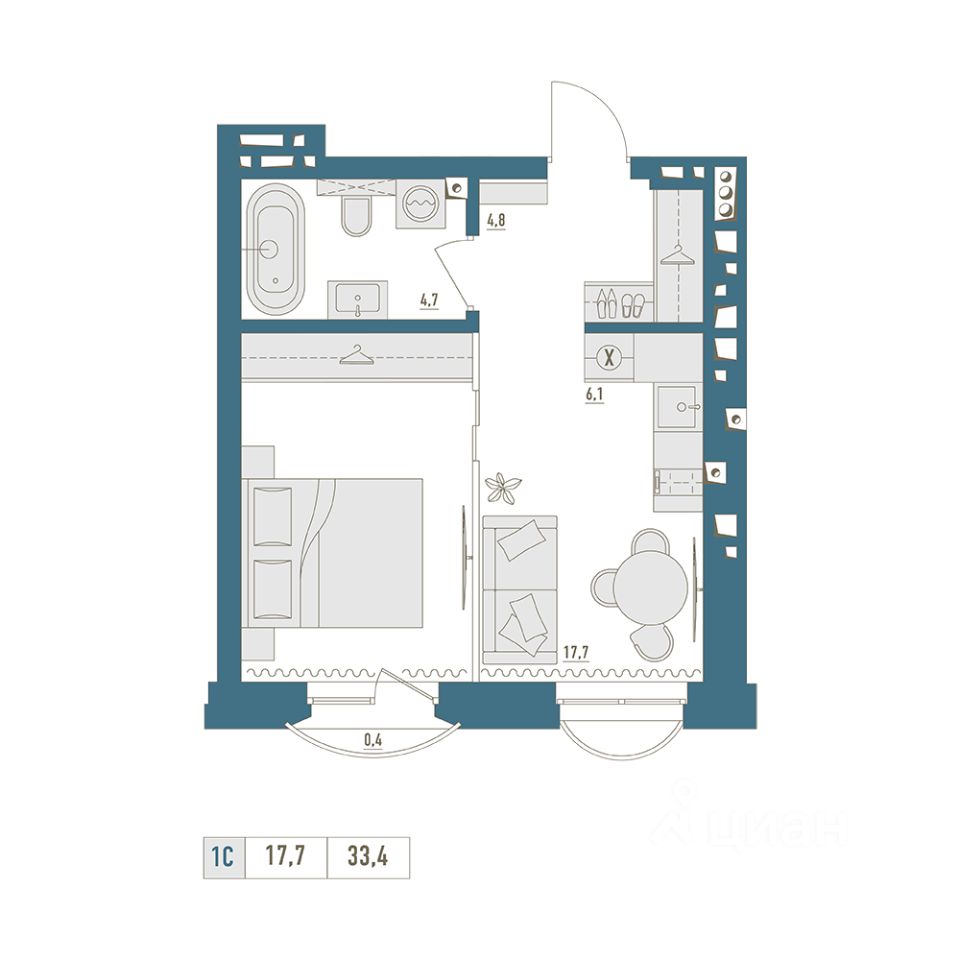 • Общая площадь: 33.4м²
