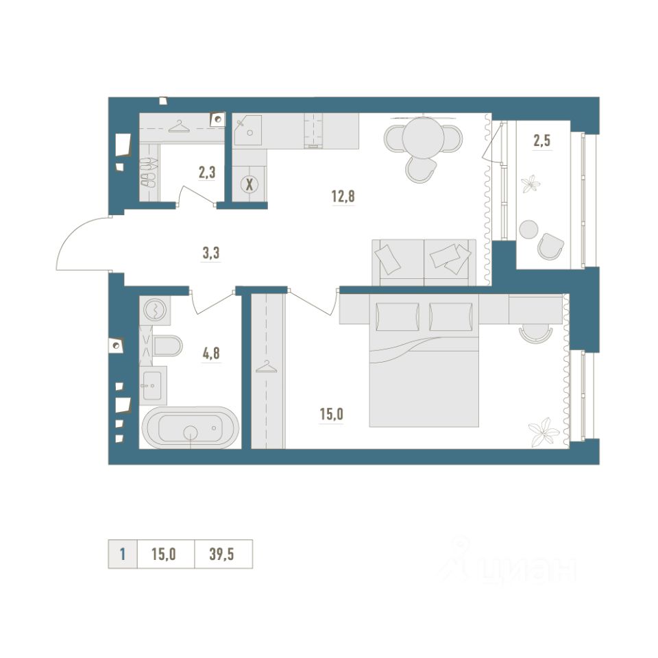 • Общая площадь: 39.5м²
