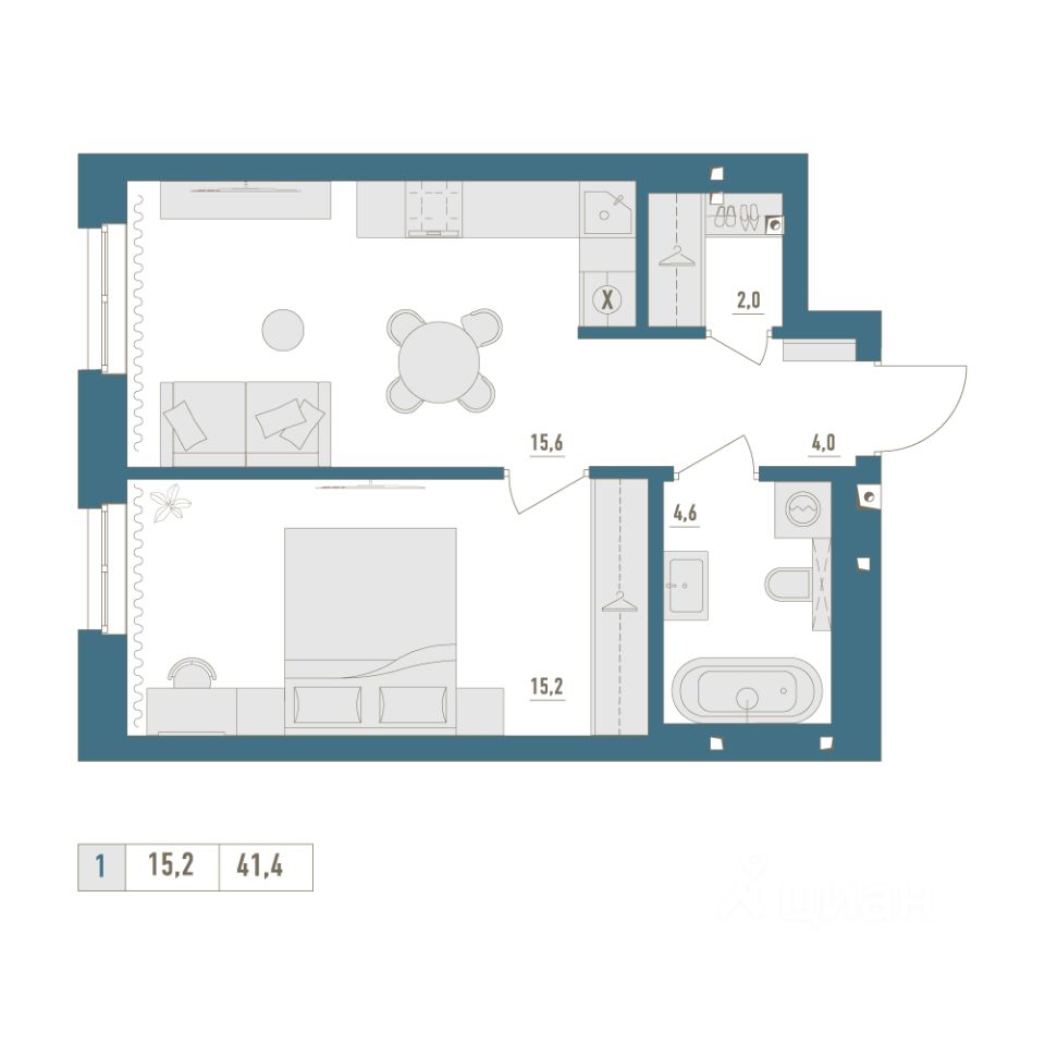 • Общая площадь: 41.4м²