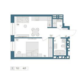 • Общая площадь: 40.9м²