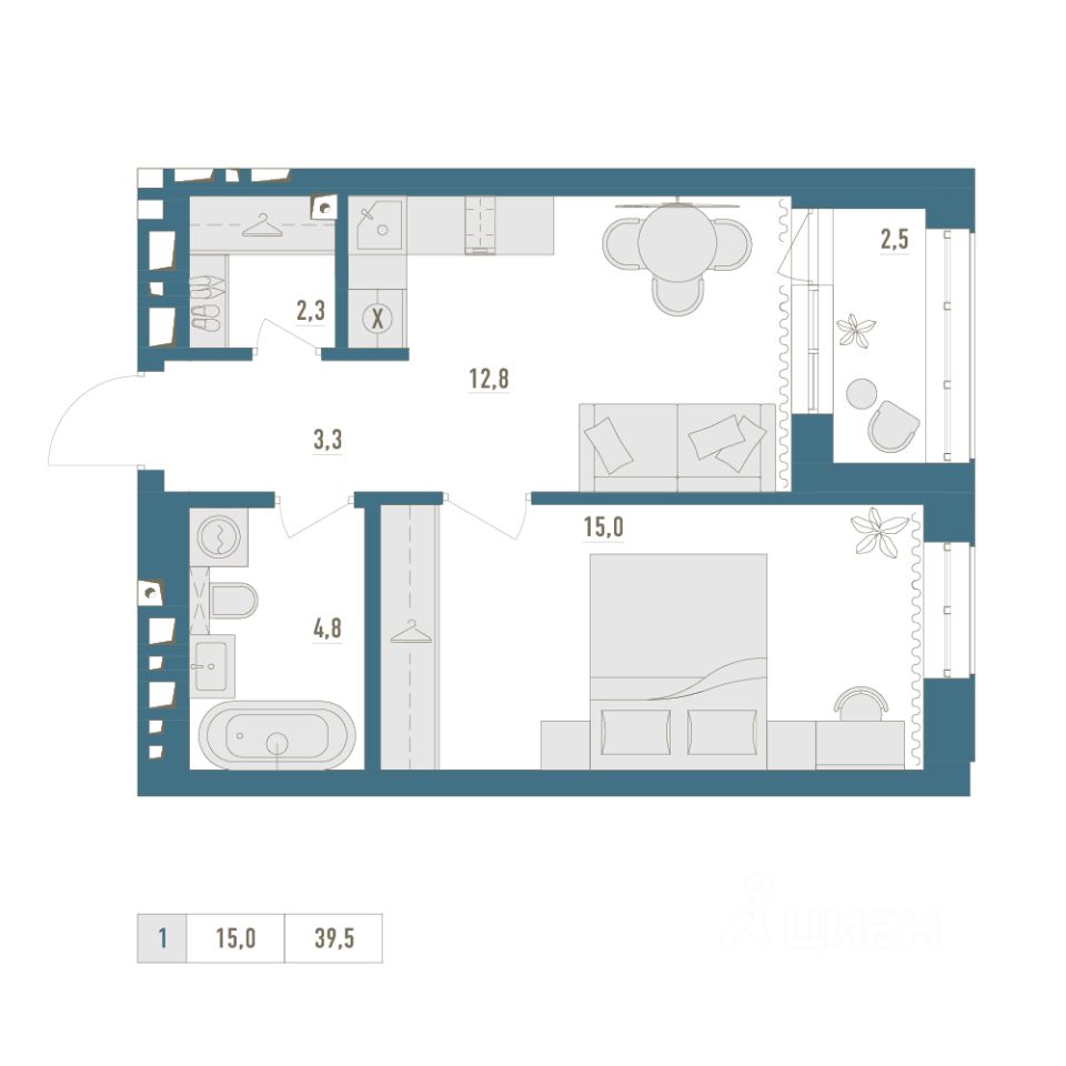 • Общая площадь: 39.5м²