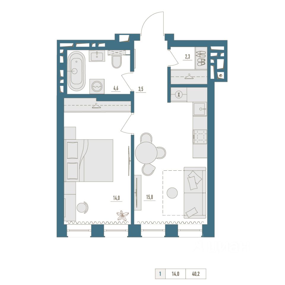 • Общая площадь: 40.2м²