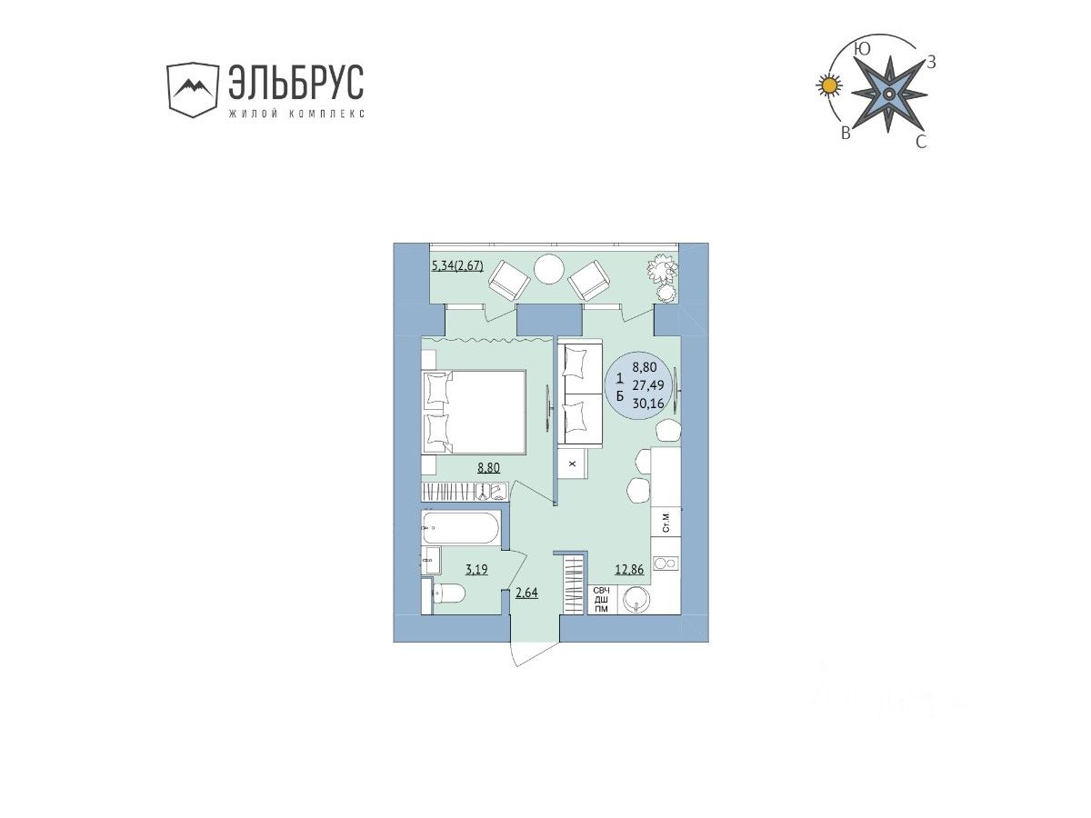 Продажа квартир от застройщика в новом жилом комплексе "Эльбрус"! Сдача в 2027 году. Кирпичный дом в самом зеленом районе Уфы. Рассрочка без процентов! Продается 1-комнатная квартира в ЖК "Эльбрус": общая площадь квартиры — 30,16 кв.м., прихожая — 2,64 кв.м., кухня — 12,86 кв.м., спальня — 8,80 кв.м., санузел совмещенный — 3,19 кв.м., лоджия — 2,67 кв.м., высота потолков — 2.5 метра. Отделка предчистовая: сухая стяжка пола, стены выровнены по маякам, улучшенная штукатурка (светлая), металлическая усиленная входная дверь. Проведена разводка: розетки, выключатели. Позвоните или напишите сообщение, чтобы узнать подробнее о жилом комплексе. Мы проконсультируем и подберем планировку, подходящую по всем вашим параметрам! Преимущества В строящемся жилом комплексе "Эльбрус" вы можете купить квартиру от застройщика на самых выгодных условиях и с большим количеством преимуществ: Дом из кирпича. Благоустроенная территория. Готовая и развитая инфраструктура. Колясочная на цокольном этаже. Закрытая детская игровая внутри дома. Коворкинг и фитнес-зал в доме. Паркинг Широкий выбор квартир: от небольших и уютных однокомнатных до просторных четырехкомнатных квартир с террасами. Добавьте объявление в избранное, чтобы не потерять его!