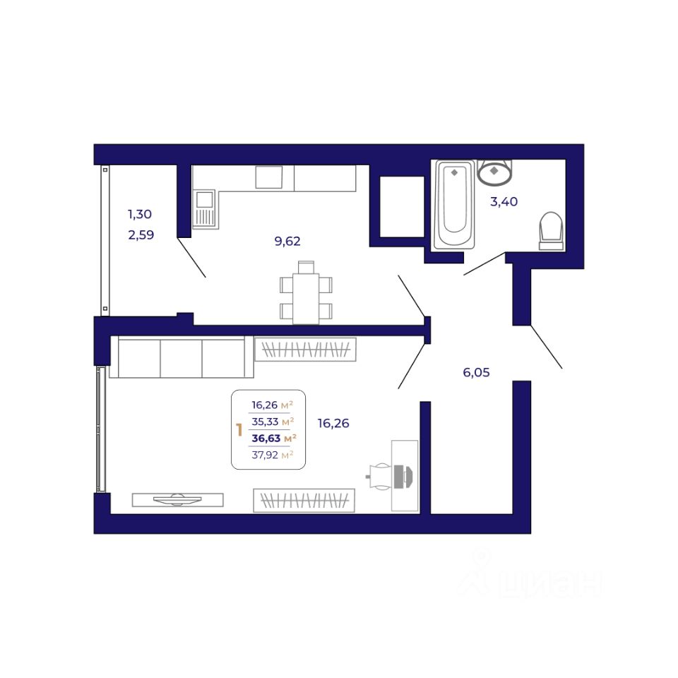 Продаётся 1-комнатная квартира в строящемся доме (Литер 3 ), срок сдачи: III-кв. 2026, общей площадью 36.63 кв.м., на 17 этаже. Современный жилой комплекс "Паруса"