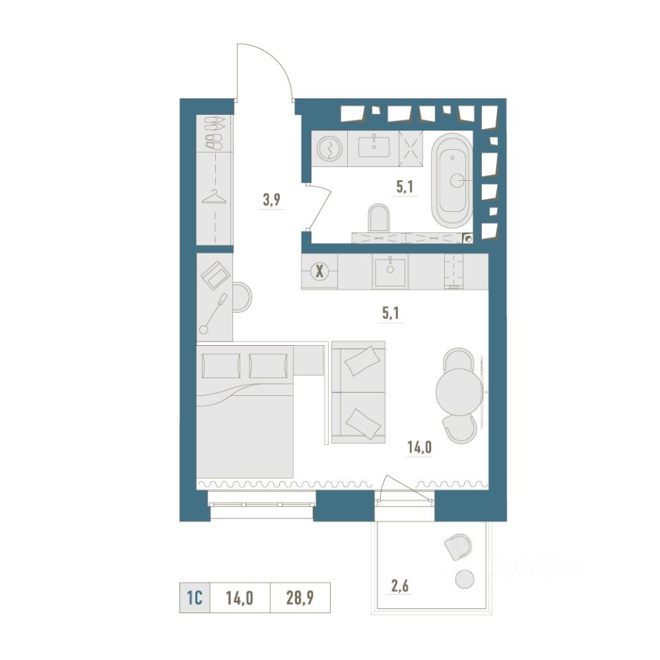 • Общая площадь: 28.9м²