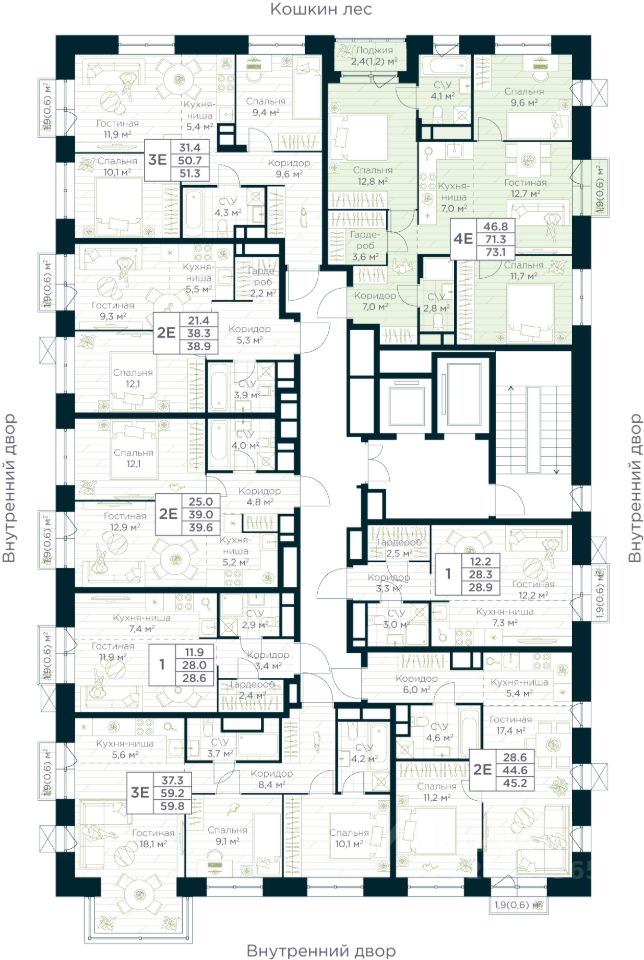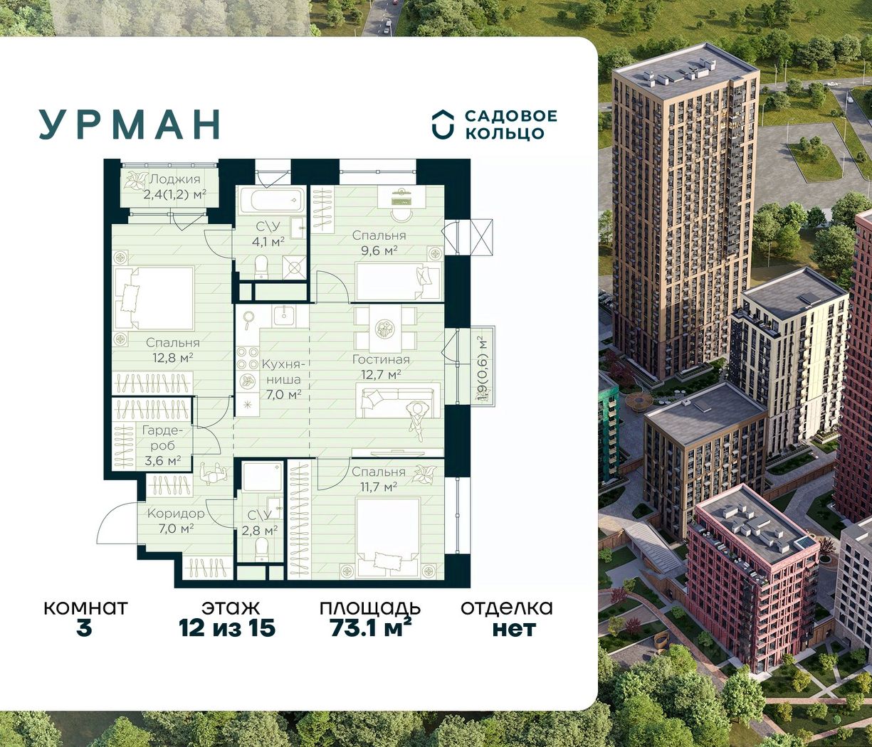 Продается квартира в ЖК Urman City с 3 спальнями на 12 этаже 15 этажного дома. Общая площадь: 73.1 кв.м. Высота потолков 3.4 м. Срок сдачи 1 квартал 2028 г. Мастер-спальня. Вид на лес. Окно в ванной. Эскроу-счет. Застройщик ГК "Садовое кольцо".