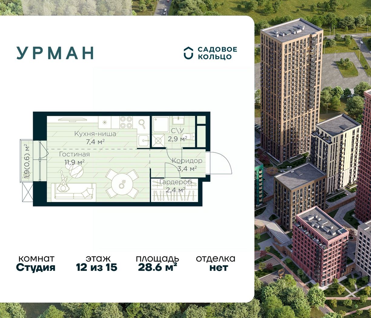 Продается квартира в ЖК Urman City студия на 12 этаже 15 этажного дома. Общая площадь: 28.6 кв.м. Высота потолков 3.4 м. Срок сдачи 1 квартал 2028 г. Эскроу-счет. Застройщик ГК "Садовое кольцо".