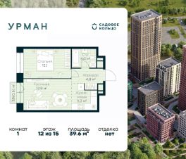 Продается квартира в ЖК Urman City с 1 спальней на 12 этаже 15 этажного дома. Общая площадь: 39.6 кв.м. Высота потолков 3.4 м. Срок сдачи 1 квартал 2028 г. Эскроу-счет. Застройщик ГК "Садовое кольцо".