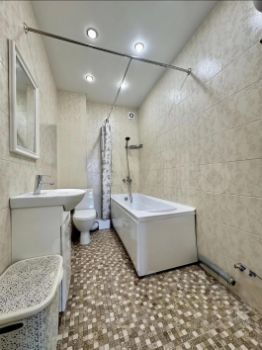 Большой санузел + гардеробная (можно превратить во второй с/у с душевой — редкое преимущество для трешки).