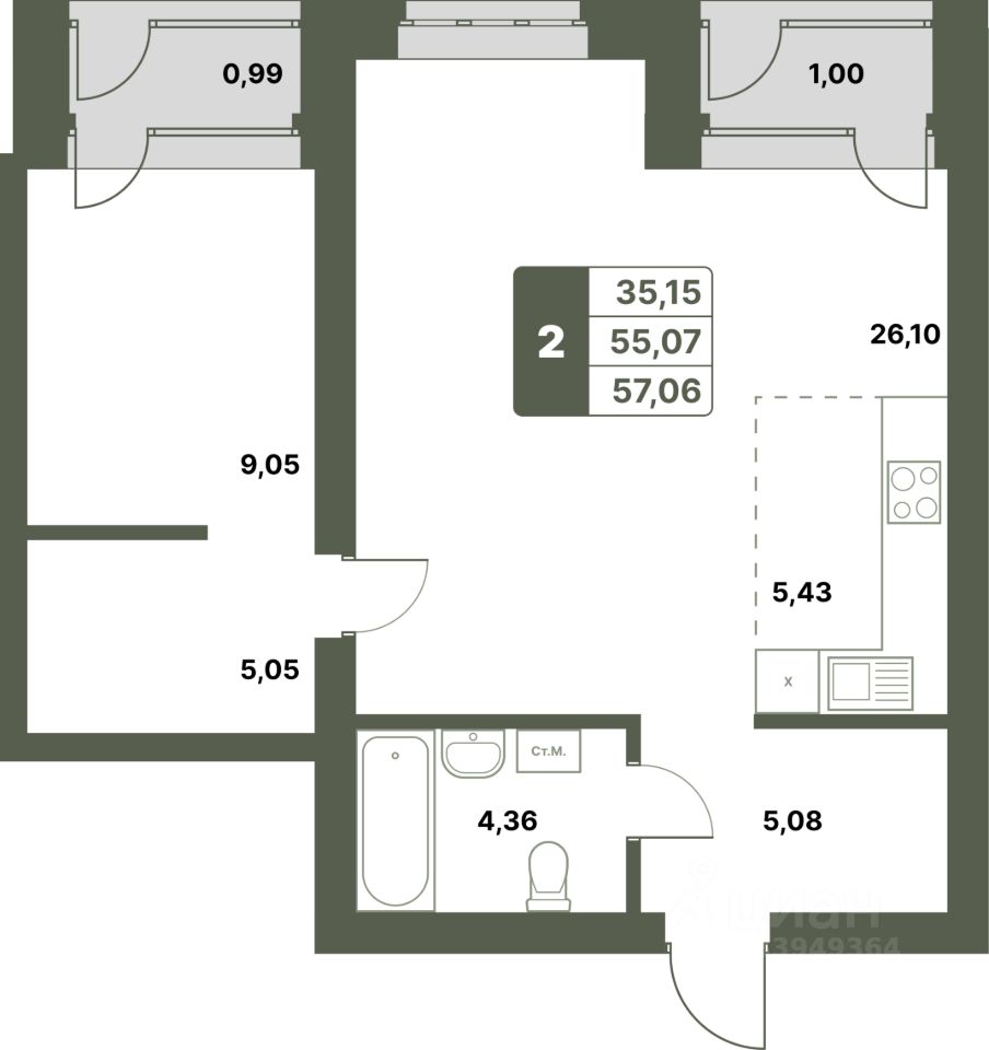 57,06 м²