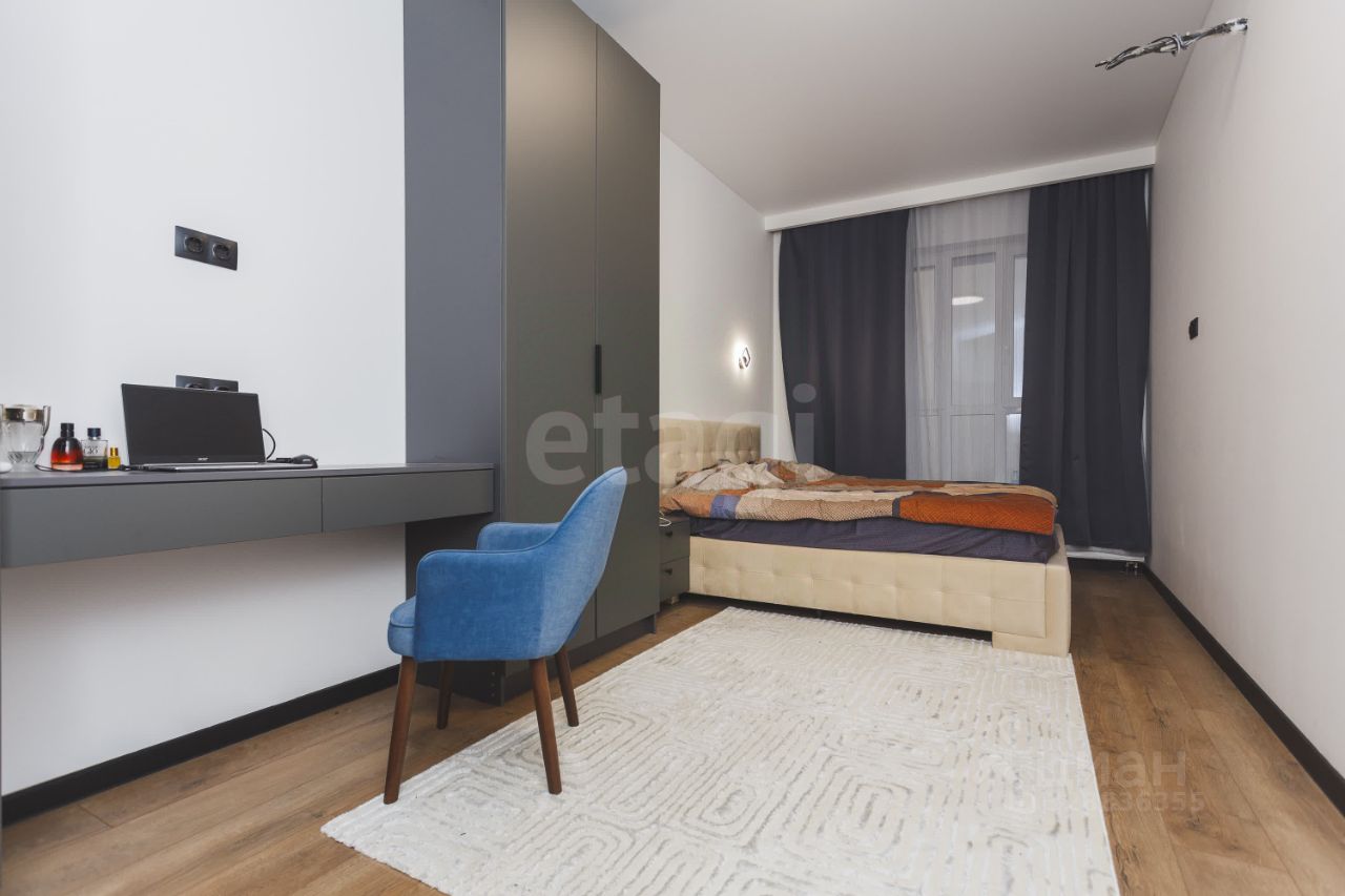 В отделке использованы декоративная штукатурка, ламинат, натяжной потолок. Остается вся мебель, кроме кровати. Санузел оборудован качественной сантехникой, все трубы подведены для установки стиральной машины. Выделена зона под кухню с возможностью монтажа раковины.