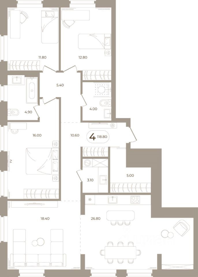 Продаётся 4-комнатная квартира в строящемся доме (Мира,70 (Корпус 1)), срок сдачи: III-кв. 2028, общей площадью 118.8 кв.м., на 2 этаже. Здесь стены - это не границы, а связующая нить времен.