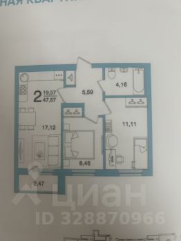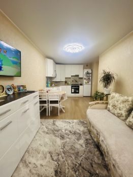 Квартира расположена на 6 этаже кирпичного дома. Площадь 48 кв.м. вместе с лоджией, где кухня-гостиная составляет порядка 17 кв.м., а комнаты 9 и 11 кв.м. Лоджия застеклена и обшита, выведено электричество, имеется встроенный шкаф для хранения. Просторная кухня-гостиная с выходом на лоджию.