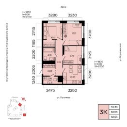 Общая площадь 62.55кв.м.;