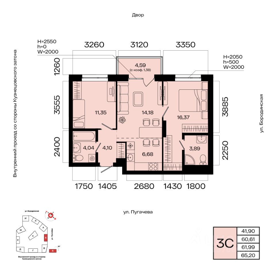 Общая площадь 61.99кв.м.;