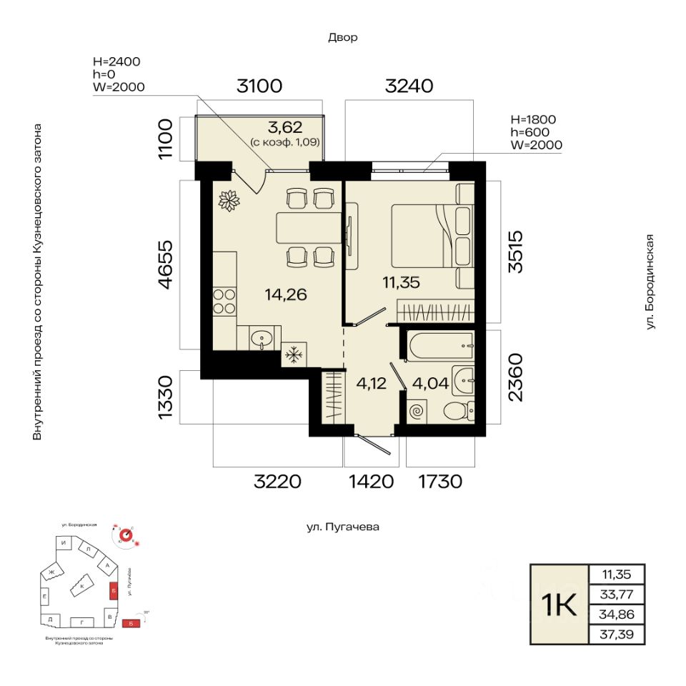 Общая площадь 34.86кв.м.;