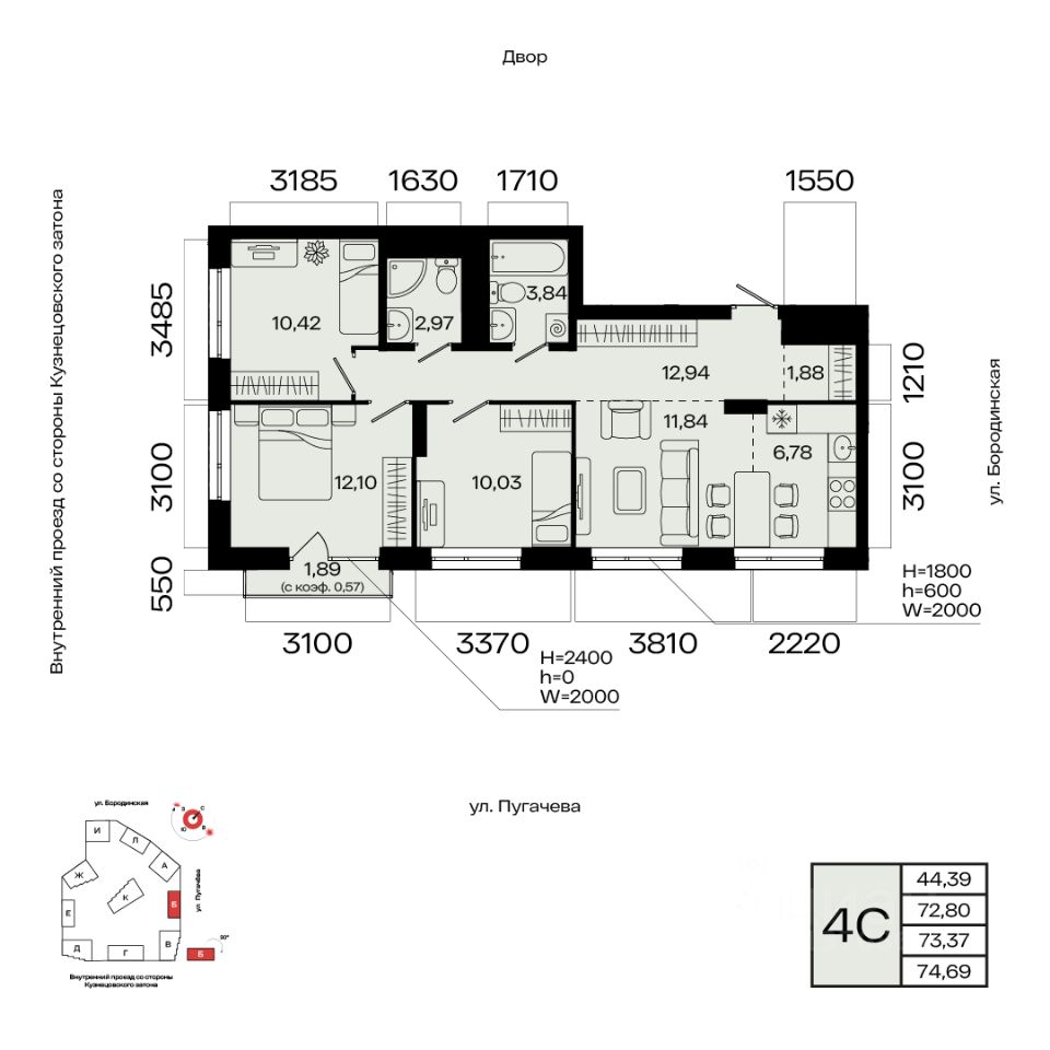 Общая площадь 73.37кв.м.;