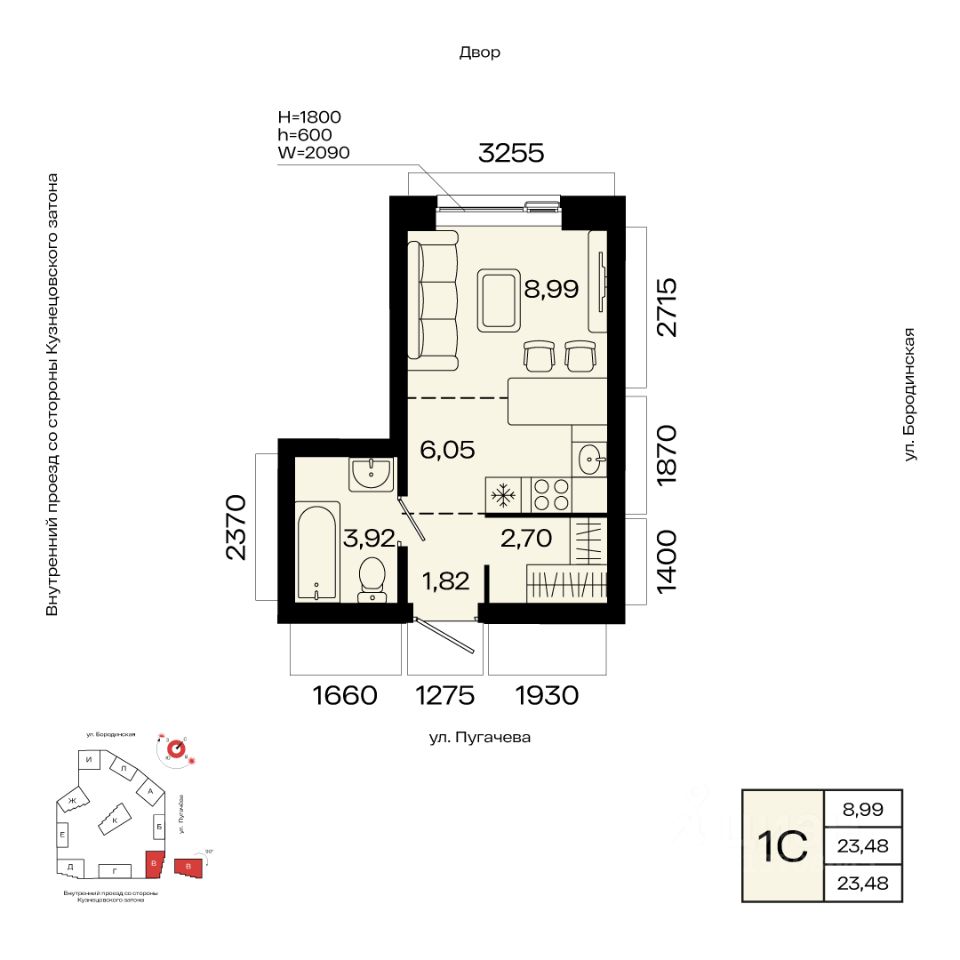 Общая площадь 23.48кв.м.;