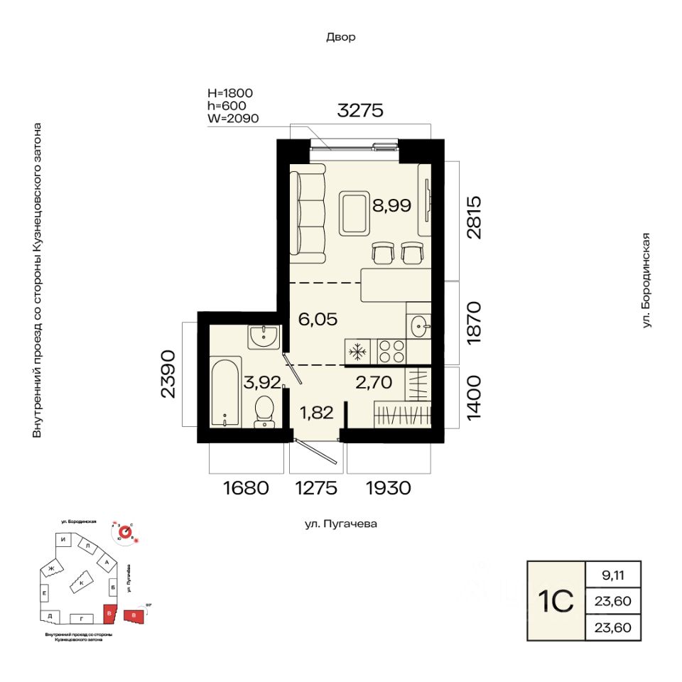 Общая площадь 23.60кв.м.;