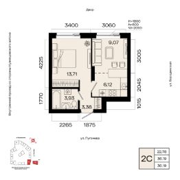 Общая площадь 36.19кв.м.;