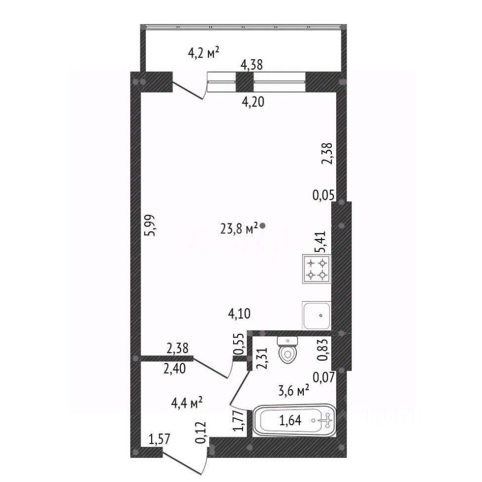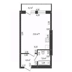Общая площадь 31,8 м2, что вполне достаточно для выделенной кухонной зоны, спального и рабочего места.