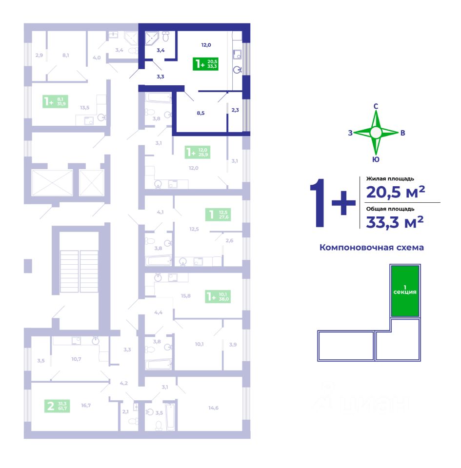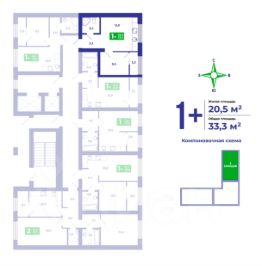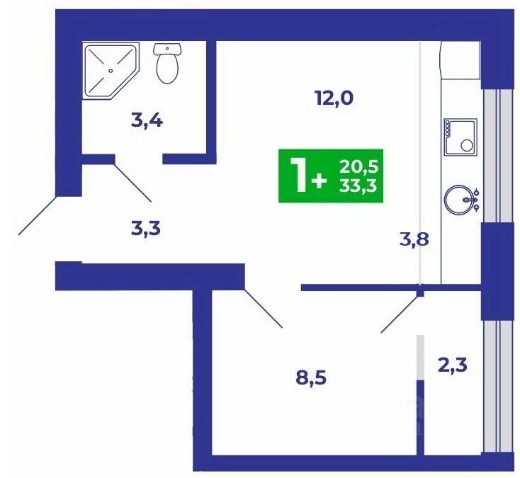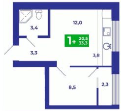 Компактная евро-однокомнатная квартира площадью 33,3 кв.м., в которой есть всё необходимое для жизни одного или двоих человек. Светлая кухня-гостиная площадью 15,5 кв.м., в которой воплотились смелые мечты о кухонном гарнитуре перед большим окном, сквозь который проникает много солнечных лучей. Спальня 8,5 кв.мм. с теплой лоджией 2,3 кв.м., которую можно присоединить к площади спальни после ввода дома в эксплуатацию, либо оставить рабочее место, кабинет или место хранения.Совмещенный санузел 3,4 кв.м.