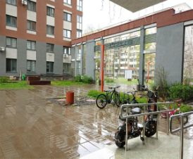 В жилом комплексе по статусу: достойные парадные, грузовые лифты, закрытый двор и отдельная детская площадка, въезд на парковку - под шлагбаум.