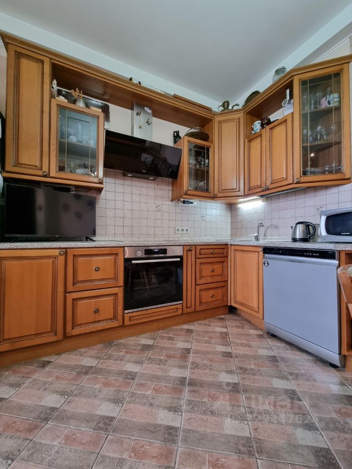 Кухня массив (Италия), встроенная бытовая техника (варочная панель, вытяжка, духовой шкаф), на полу - паркет, керамическая плитка в с/у.