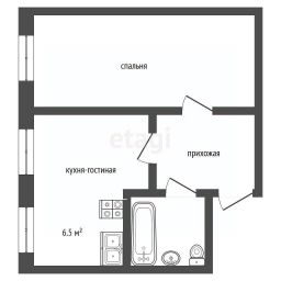 Планировка включает в себя: кухню-гостиную с перепланировкой, изолированную спальную, просторную прихожую и санузел.
