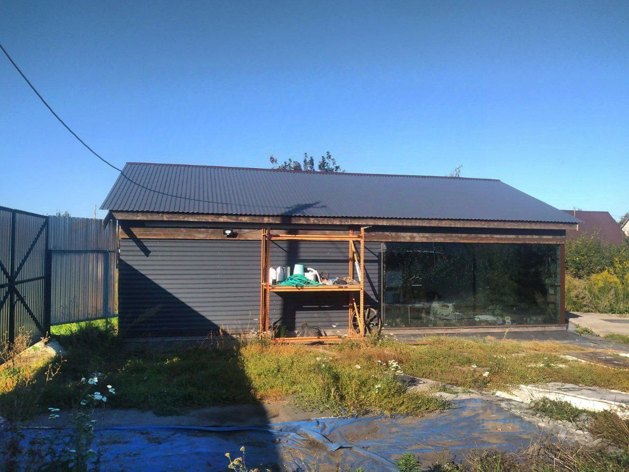 Основной дом-гараж-мастерская 7х11м, фундамент - цельная монолитная плита 30см с двойным армированием, металлокаркас, огромные тёплые панорамные окна 5х2.5м, половина всей площади - утеплённые две комнаты одна использовалась под мастерскую, другая как жилая для круглогодичного проживания с тёплым полом, утепление - PIR плиты, внутри. полностью оборудованный сан-узел.