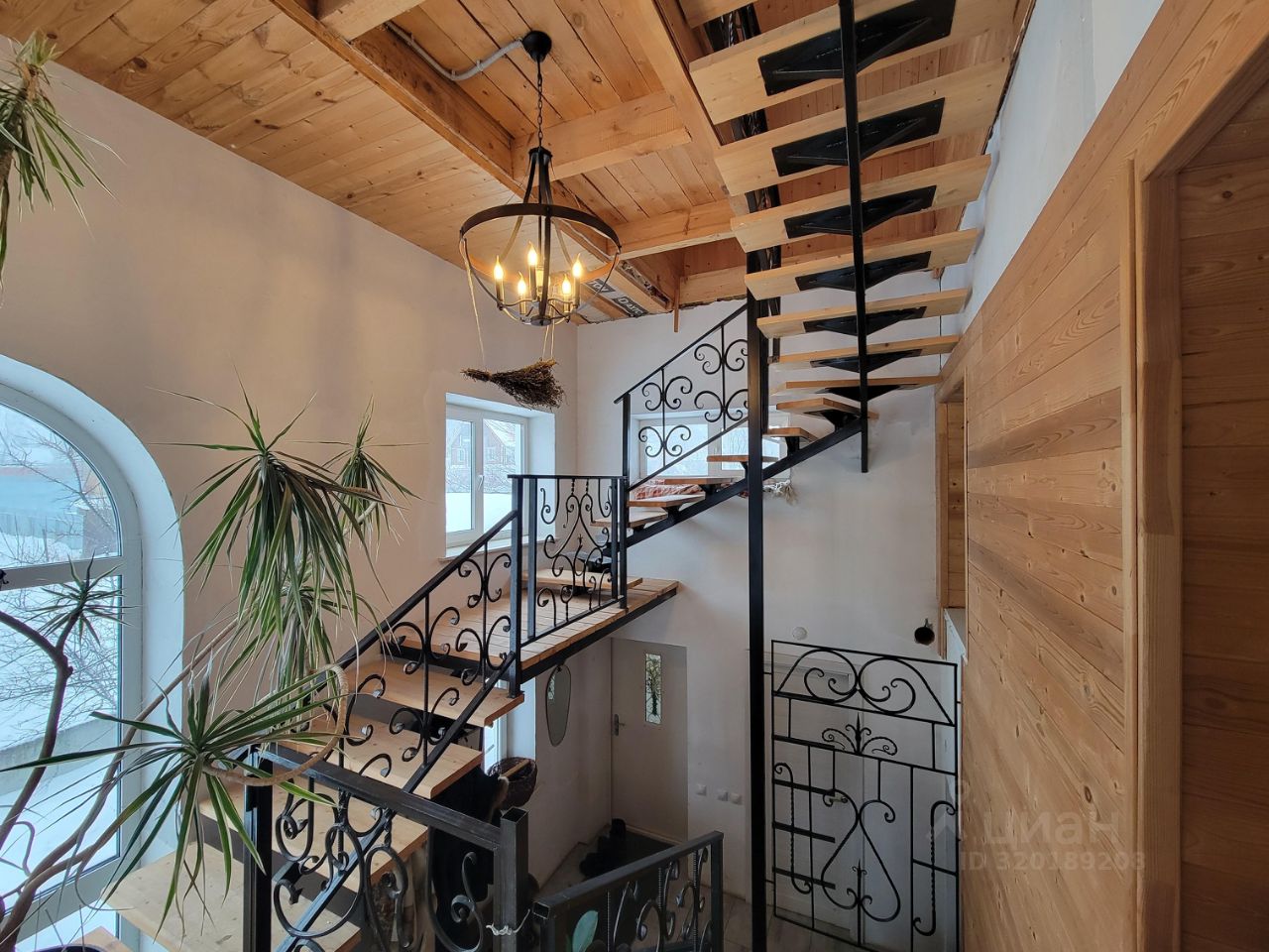 В прихожей находится лестница с выходом на все уровни, в том числе, и на балкон и мансардный этаж (чердак) площадью 160 метров.