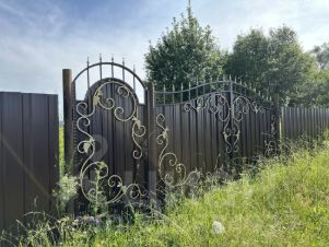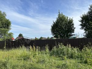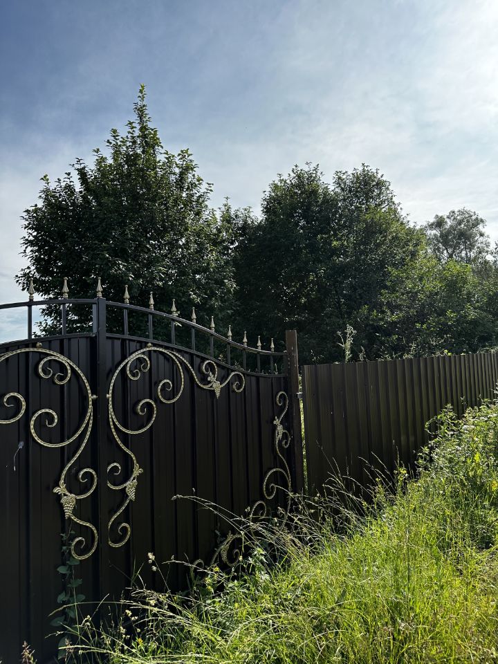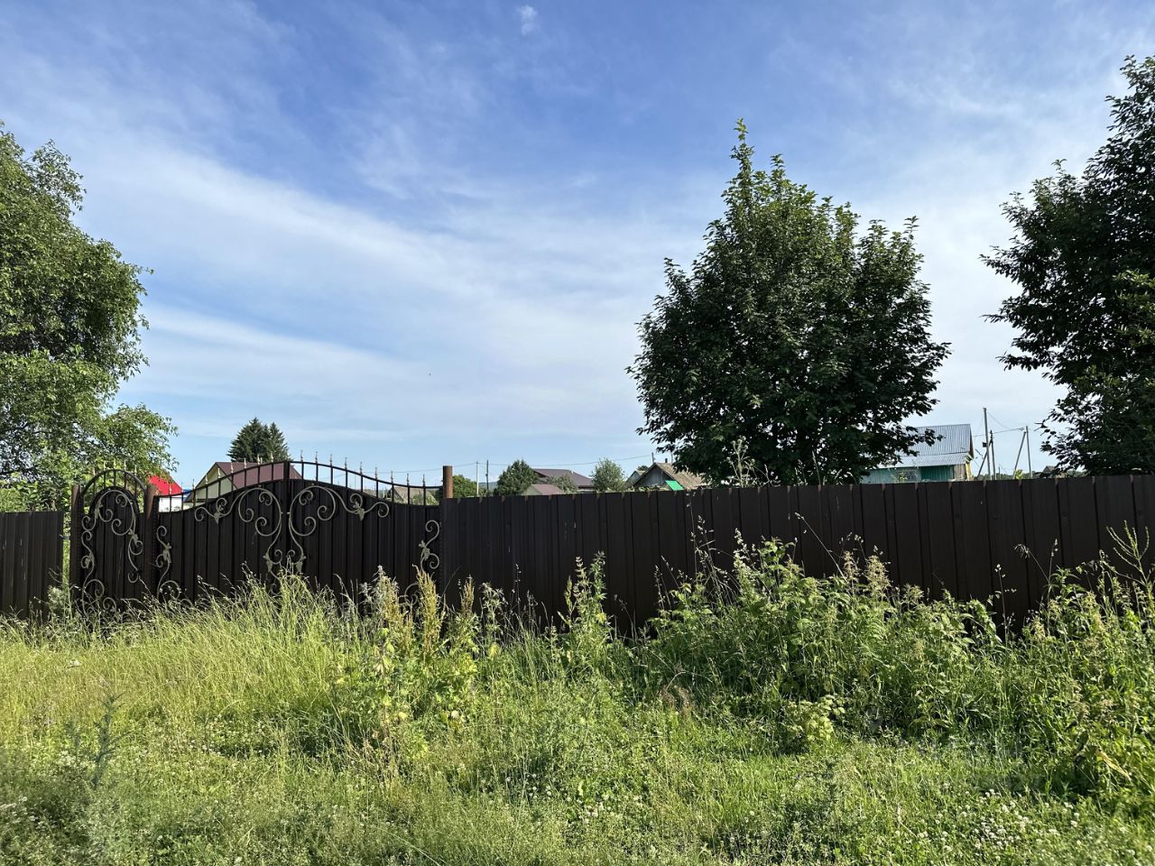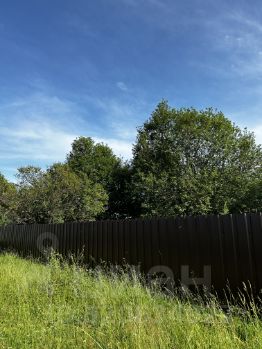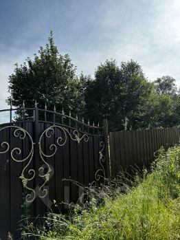 Участок огорожен современным профнастилом и оборудован прочными воротами. Внутри растут живописные деревья, создающие атмосферу уюта и гармонии.
