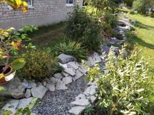 альпинарий, декоративный сухой ручей, березы