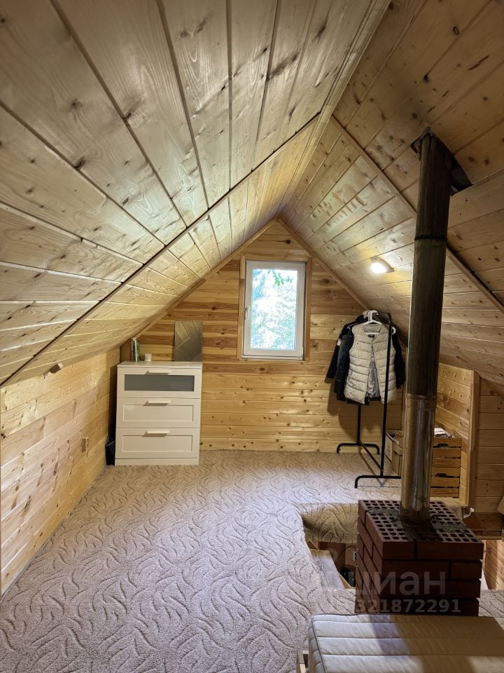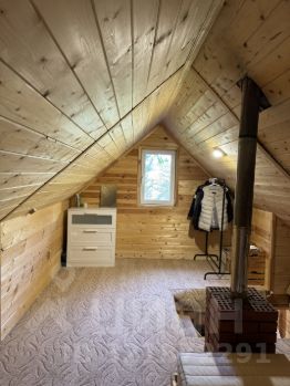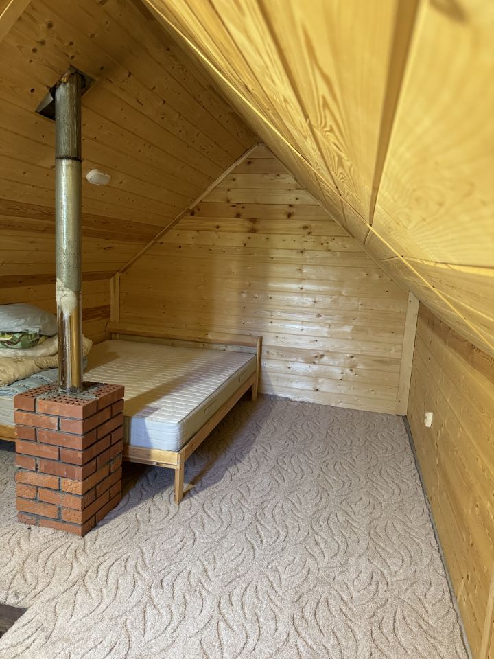 Второй этаж бани ,мансарда, обшита имитацией бруса, на полу ковролин, кровать, комод, вешалка
