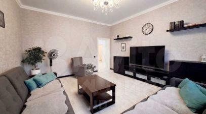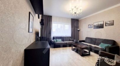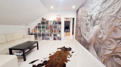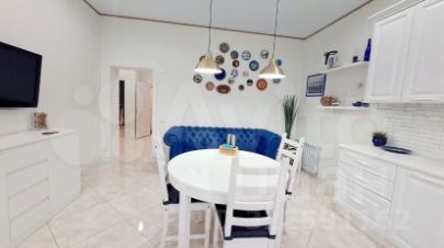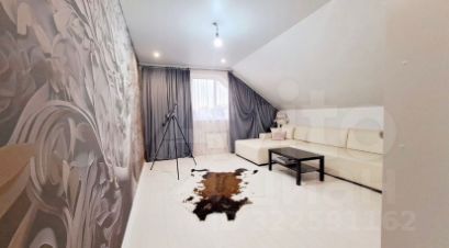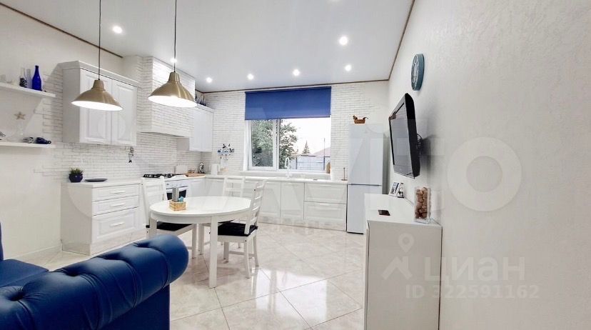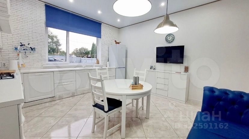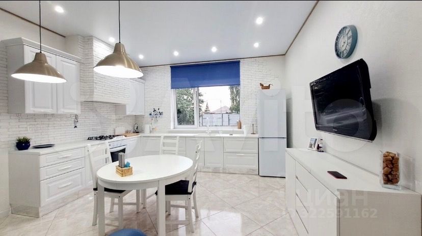 Современный дизайнерский ремонт создает атмосферу уюта и комфорта. На первом этаже просторная гостиная с мягкой мебелью и стильной картиной на стене, кухня-столовая с ярким акцентом в виде круглого стола и встроенной техникой.