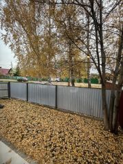 Огорожен забором