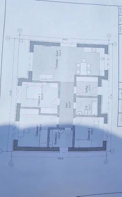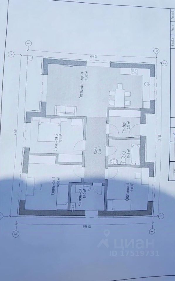 В доме есть большая кухня - гостиная площадью 35.42 кв.м, и три комнаты площадью 14.88 кв.м, 14.11 кв.м, 12.13 кв.м. Так же есть большой санузел площадью 5.43 кв.м, и котельная 5.4 кв.м. В гостиной есть панарамное окно.
