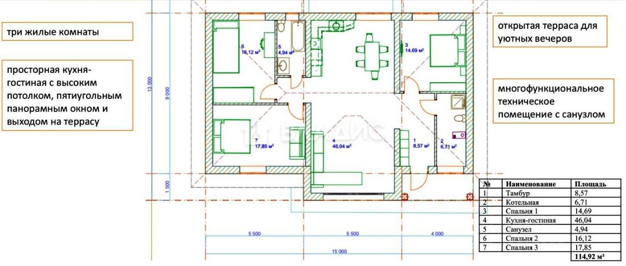 Дом построен в 2024 году из газобетона , общая площадь — 114,2 кв. м. Жилая площадь составляет 48,66 кв. м, а площадь кухни — 46,04 кв. м. Три комнаты площадью 14,69 + 16,12 + 17,85 кв. м, удобная планировка.