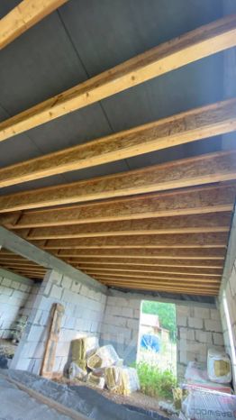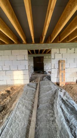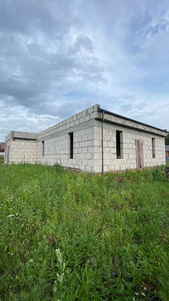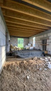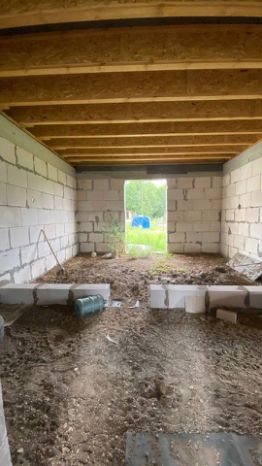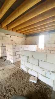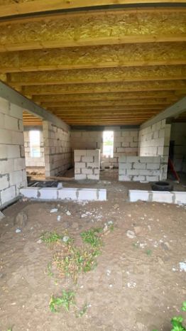 Стены возведены из газоблоков. Плоская кровля. Канализация, свет в дом заведены. Газ по улице.