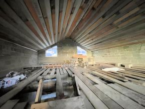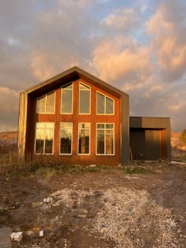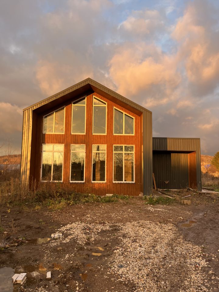 Двухэтажный, с просторным залом со вторым светом, уже заведены электричество, вода, установлен септик, выполнена заливка чернового пола. Усиленный свайноленточный фундамент, из керамзита, с утеплителем, внешняя отделка - профлист. Дом без внутренней отделки - можно реализовать любые дизайнерские решения.